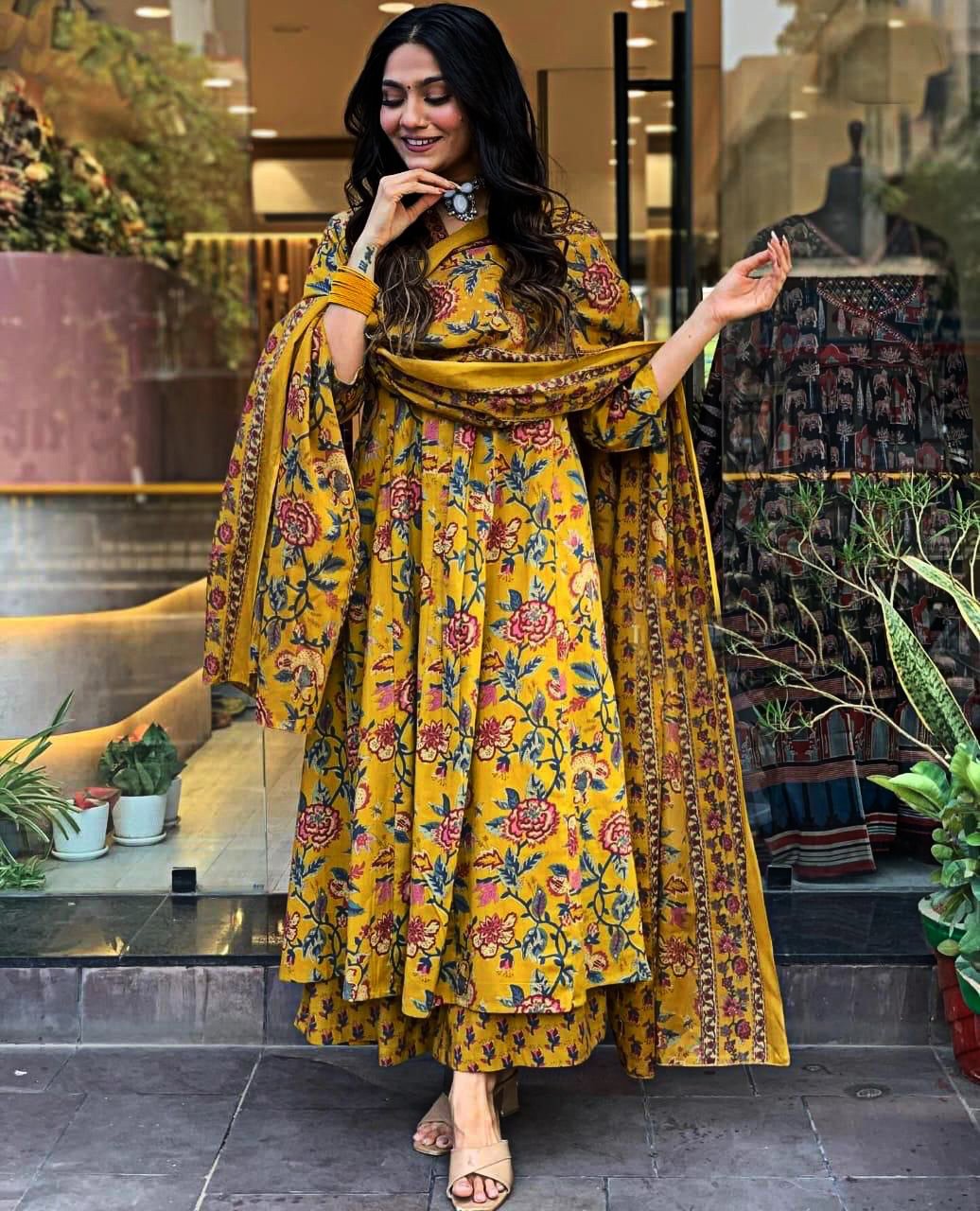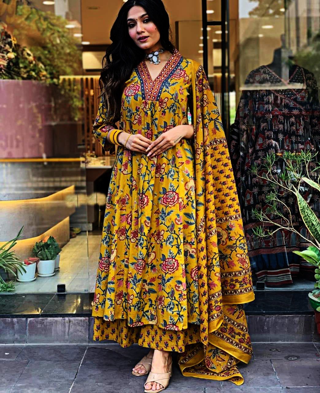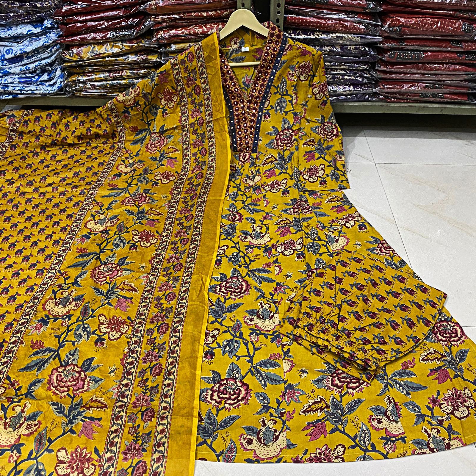 New stylish and affordable beautiful look straight alia cut set with beautiful print and fabric pure Cotton💃💃